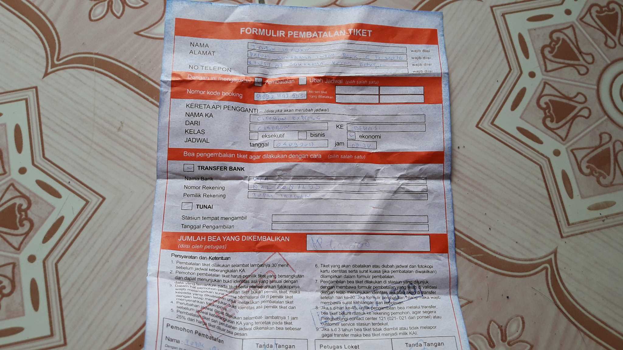 Datang ke stasiun dan langsung menuju loket pembatalan untuk meminta formulir pembatalan tiket yang bentuknya kayak gini.