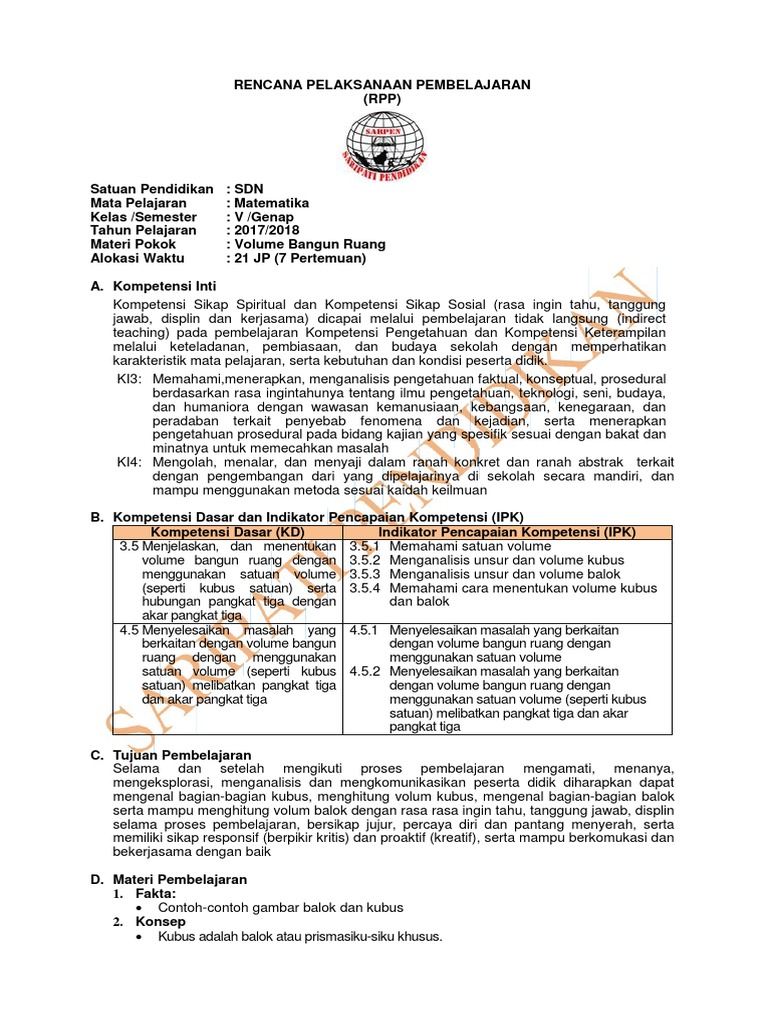 Rpp Matematika Kelas 5 Semester 2 Kurikulum 2013 Revisi 2017