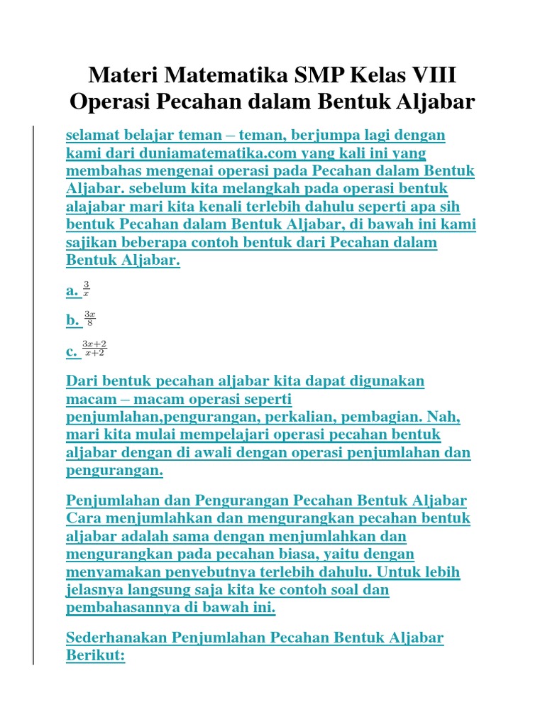 Materi Matematika Smp Kelas Viii Operasi Pecahan Dalam Bentuk Aljabar