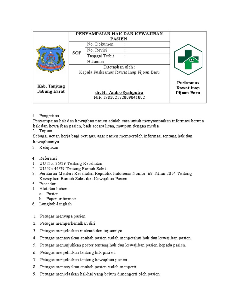 5 Sop Penyampaian Hak Dan Kewajiban Pasien Kepada Pasien Dan Petugas