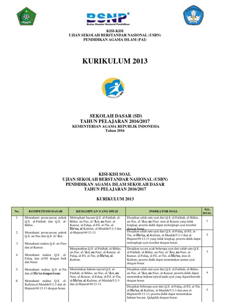 Download Kisi Kisi Usbn Pai Sd Tahun Pelajaran 2016 2017 Daily Sekolah