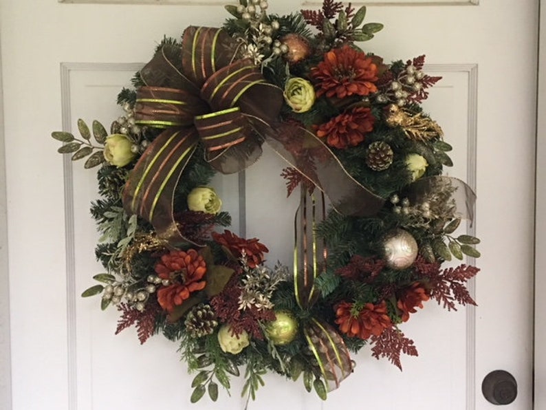 Christmas Holiday Brown And Bronze Xenia Green Rose Door Decor Etsy