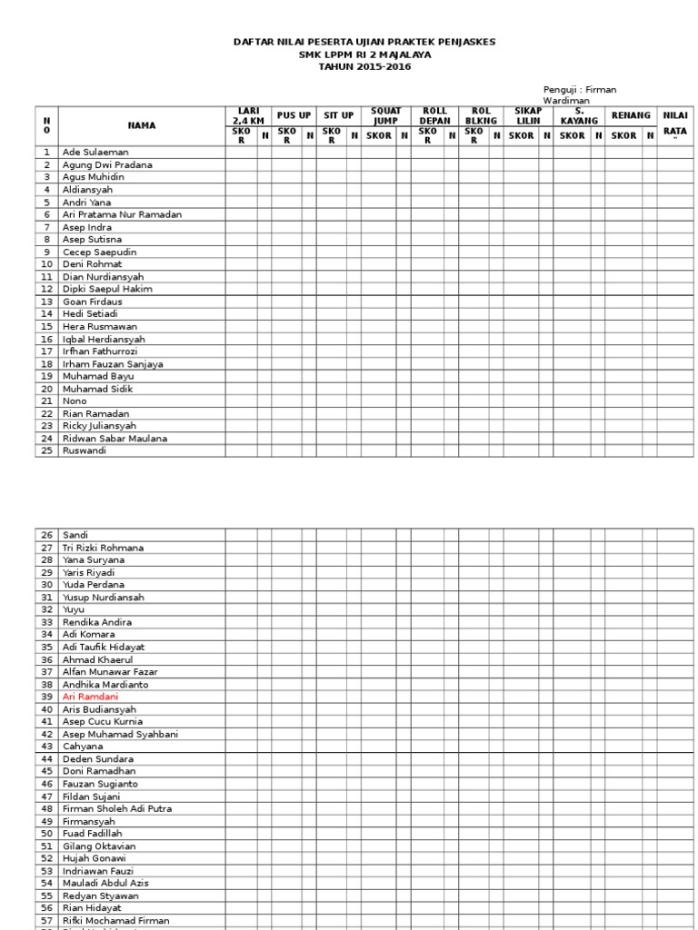 Daftar Nilai Peserta Ujian Praktek Penjaskes