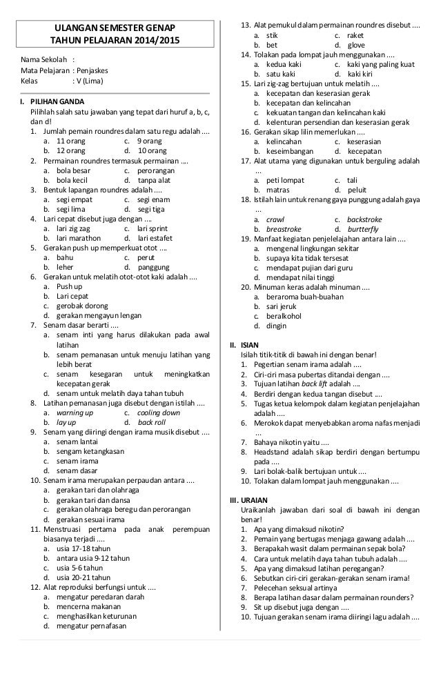 Soal Penjaskes Smp Kelas 9 Semester 2 Dan Kunci Jawaban Kumpulan