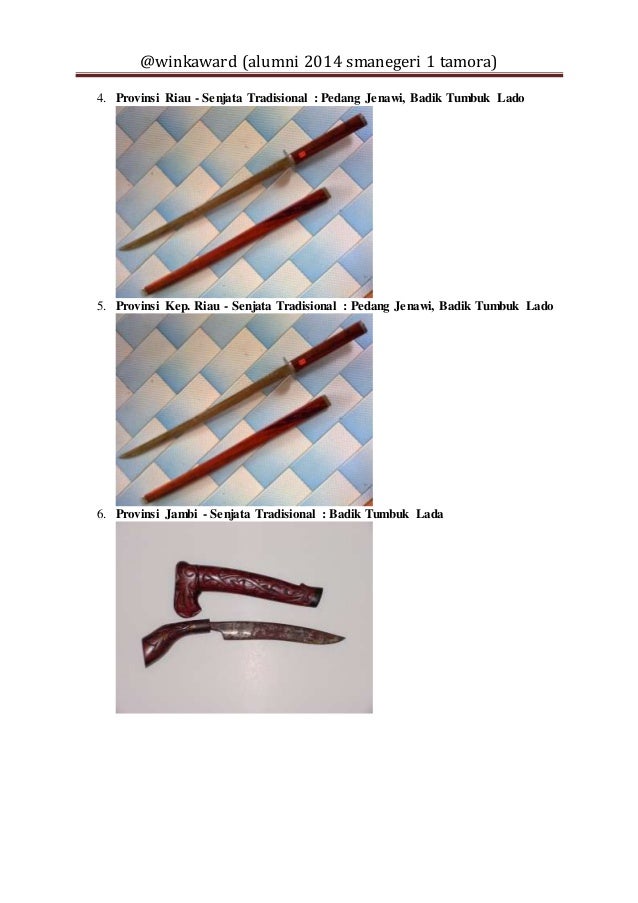 Senjata tradisional riau pedang jenawi. Senjata tradisional riau masyarakat melayu riau memiliki senjata tradisional yang bernama pedang jenawi. Senjata tradisional kepulauan riau pedang jenawi pedang jenawi merupakan sejenis senjata tradisional berupa pedang yang dipergunakan oleh para panglima perang. Senjata tradisional riau dan kepulaua riau pedang jenawi balada tumbuk lada keris belada kelewang dan penjelasannya lengkap dan singkat.