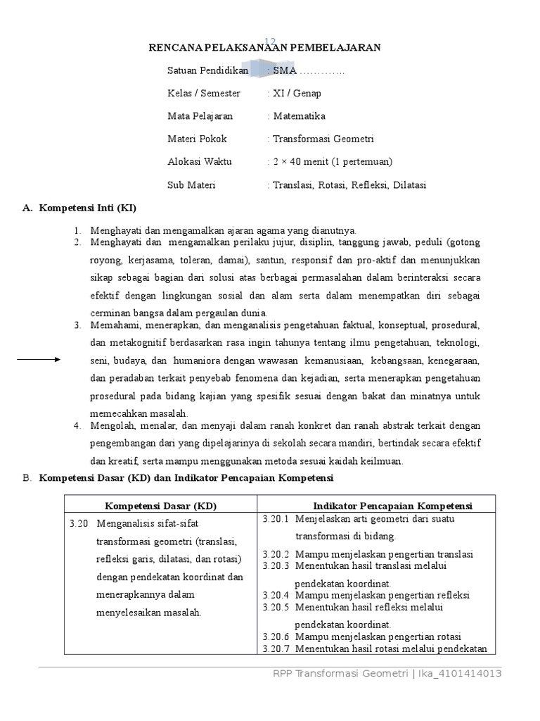 Lembar Aktivitas Siswa Transformasi Geometri Objek Dan Menerapkan