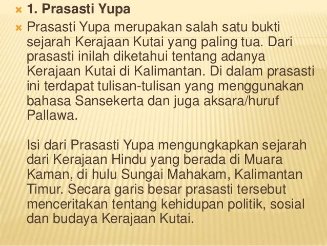 Bukti tertua mengenai keberadaan aksara nusantara yaitu berupa tujuh buah yupa tiang batu untuk menambatkan tali pengikat sapi yang bertuliskan prasasti mengenai. Bukti tertua mengenai keberadaan aksara nusantara yaitu berupa tujuh buah yupa tiang batu untuk menambatkan tali pengikat sapi yang bertuliskan prasasti mengenai. Prasasti yupa ditemukan di bukit berubus muara kaman kalimantan timur pada tahun 1879.