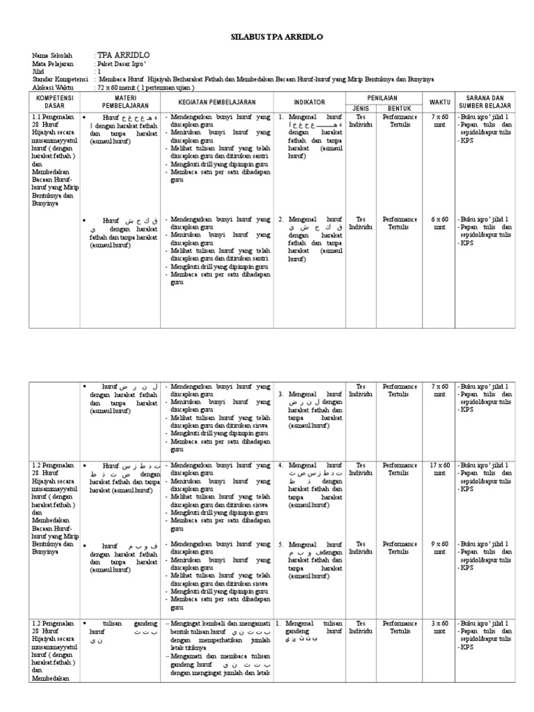 Contoh Silabus Pondok Pesantren Hidayatus Saalikin