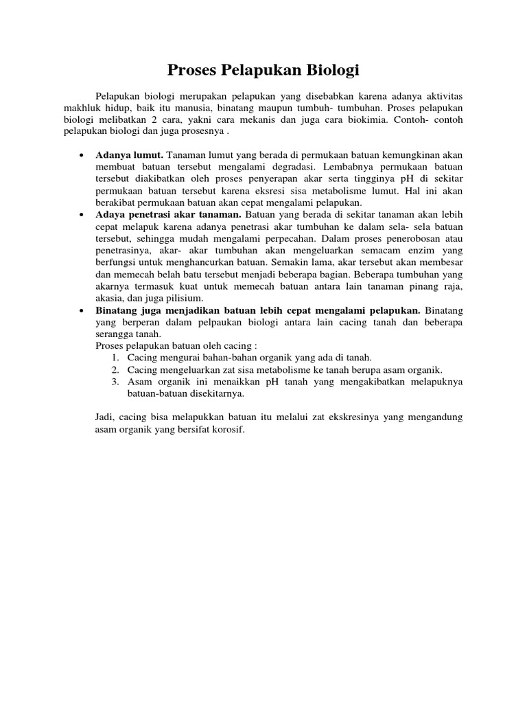 Contoh pelapukan biologi. Pelapukan adalah proses alterasi dan fragsinasi batuan dan material tanah pada danatau dekat permukaan bumi yang disebabkan karena proses fisik kimia dan biologi. Berkat rahmat dan karunia nya kami dapat menyelesaikan karya ilmiah yang berjudul pengaruh media tanah. Tanah liat primer dihasilkan dari pelapukan batuan karena tenaga endogen namun tidak berpindah dari batuan induknya sehingga sifatnya lebih murni daripada tanah.