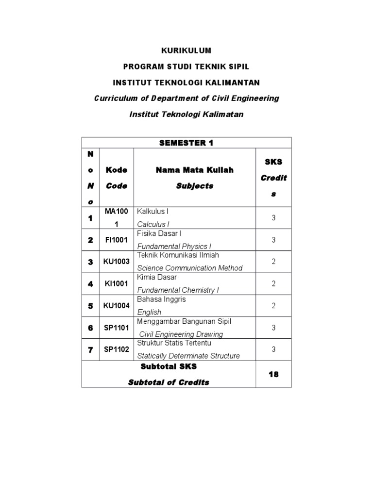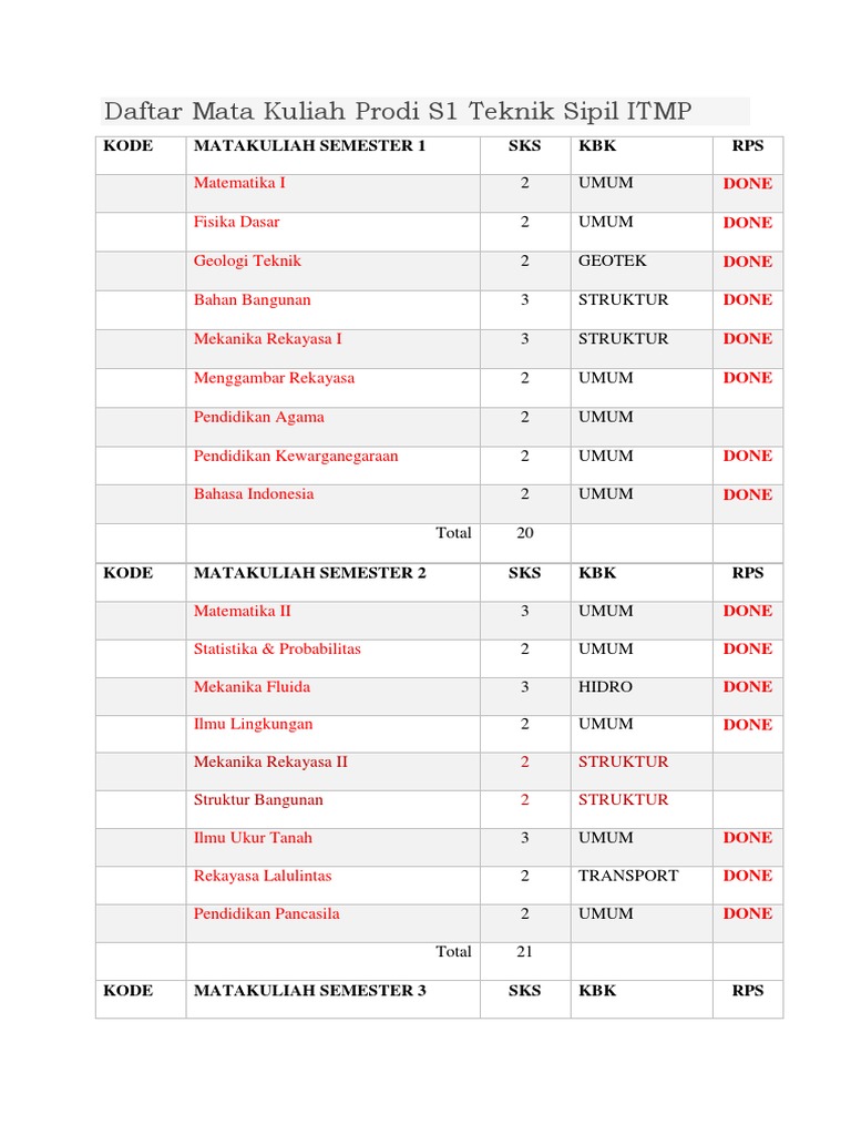 Daftar Mata Kuliah Prodi S1 Teknik Sipil