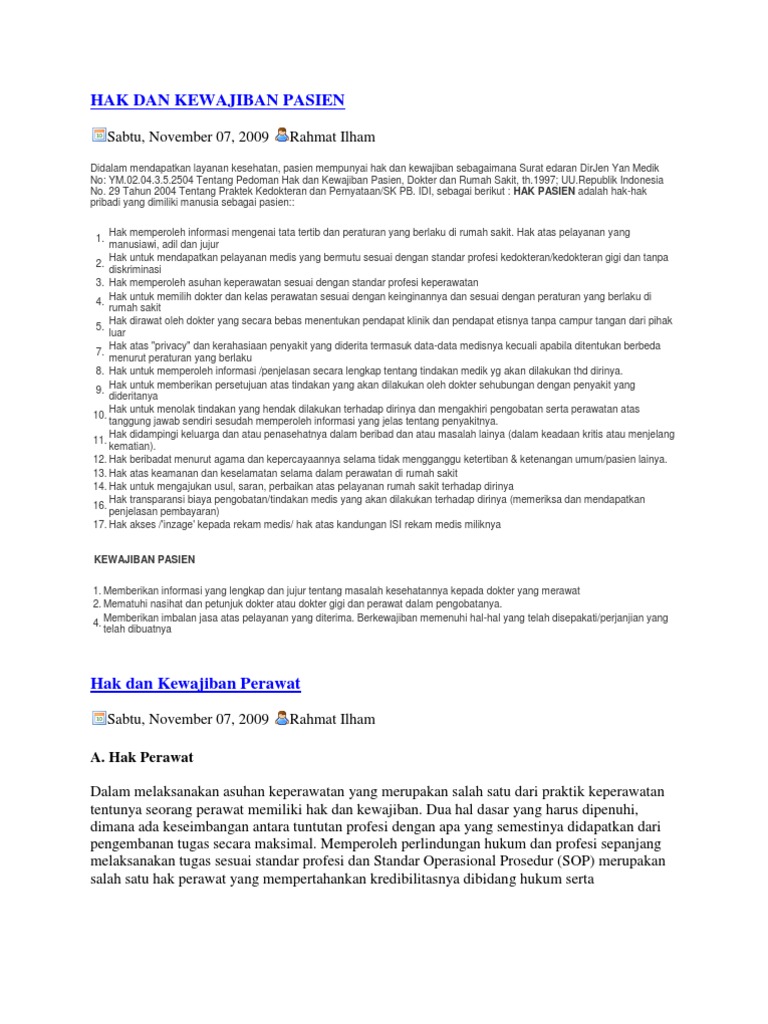 Hak Dan Kewajiban Pasien Perawat Rumah Sakit Dasar Hukum