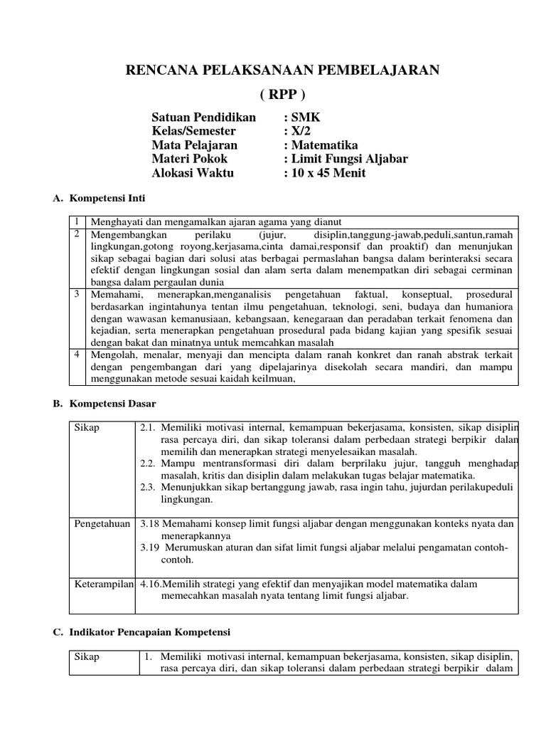 Contoh Rpp Matematika Kelas X Dengan Topik Limit Fungsi Aljabar