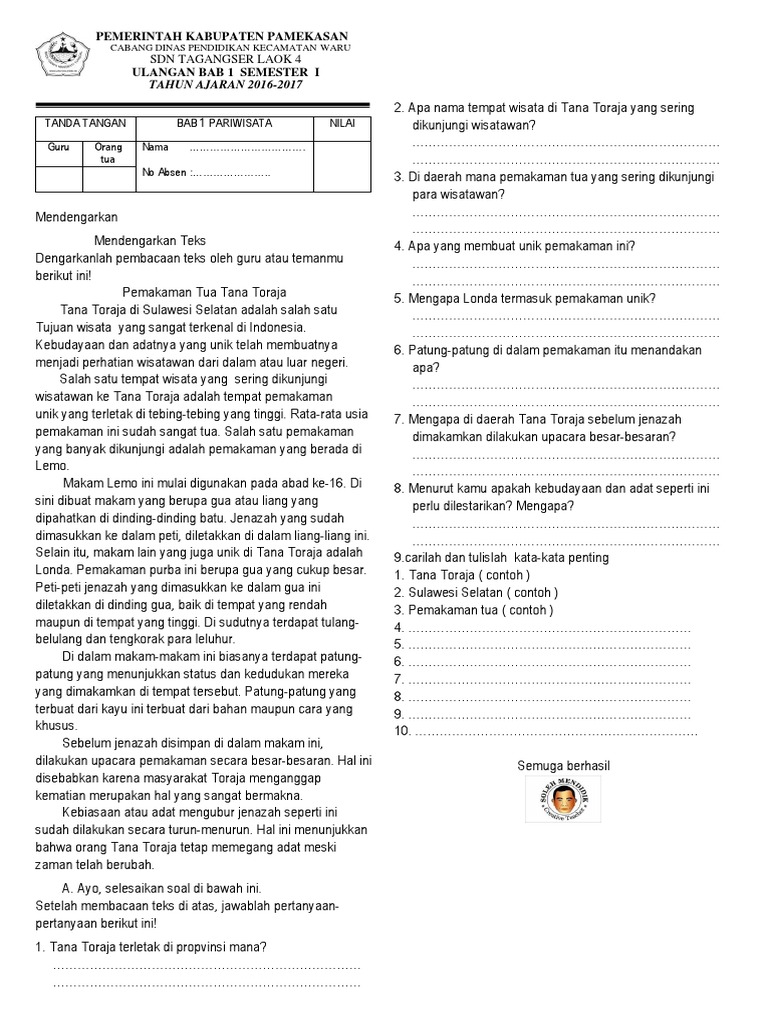 Ulangan Bahasa Indonesia Bab 1 Semester I
