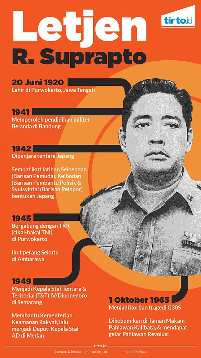 Sawise proklamasi kamardikan soeprapto gabung dadi tentara keamanan rakyat tkr bibit kawite militer indonesia. Dibangun untuk mengingat perjuangan para pahlawan revolusi yang berjuang. National hero of indonesia indonesian.