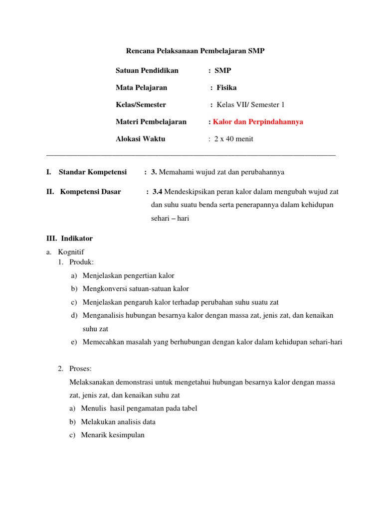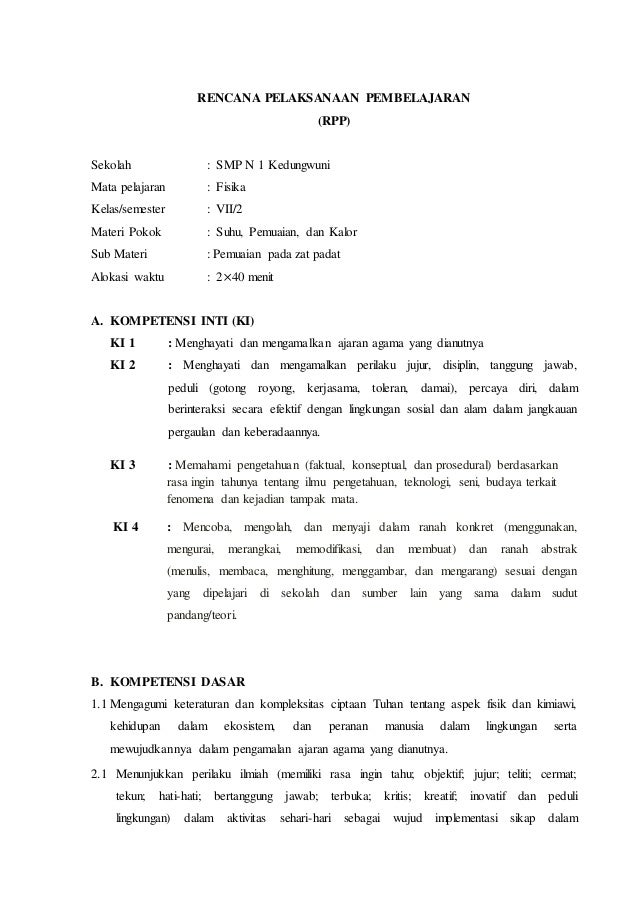 Rpp Berbasis Kurikulum 2013 Kelas Vii Suhu Pemuaian Dan Kalor