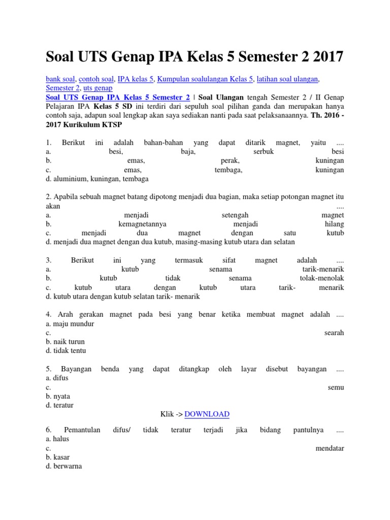 Soal Uts Ipa Kelas 5 Semester 2 Tahun Ajaran 2017 2018 Juragan Les