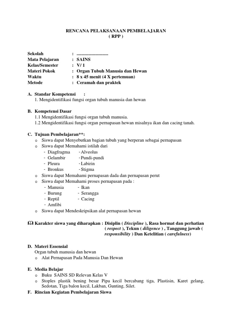 Rencana Pelaksanaan Pembelajaran Organ Tubuh Manusia Dan