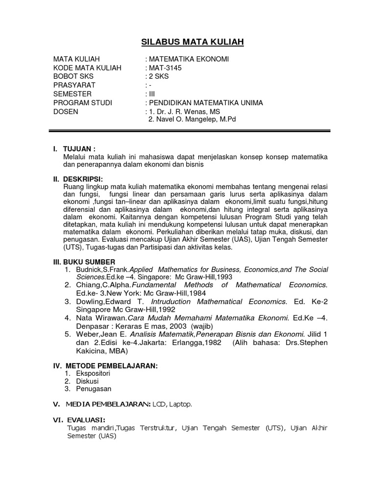 Silabus Mata Kuliah Matematika Ekonomi Dr M Lasut