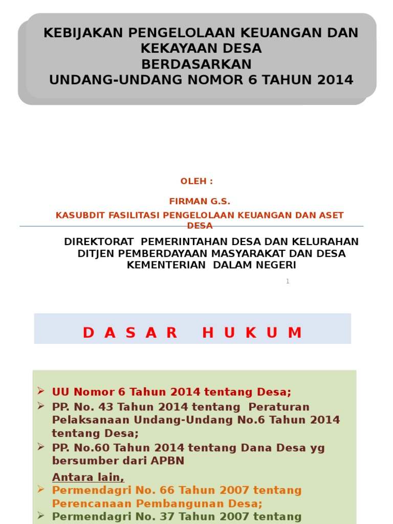 Pemerintahan desa uu ri no 6 tahun 2014. 6 tahun 2014. Kasubdit fasilitasi pengelolaan keuangan dan aset desa.