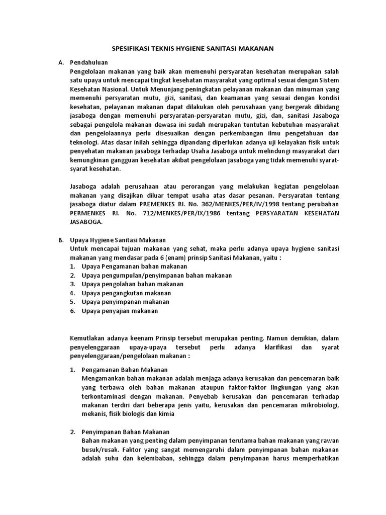 Spesifikasi Teknis Hygiene Sanitasi Makanan