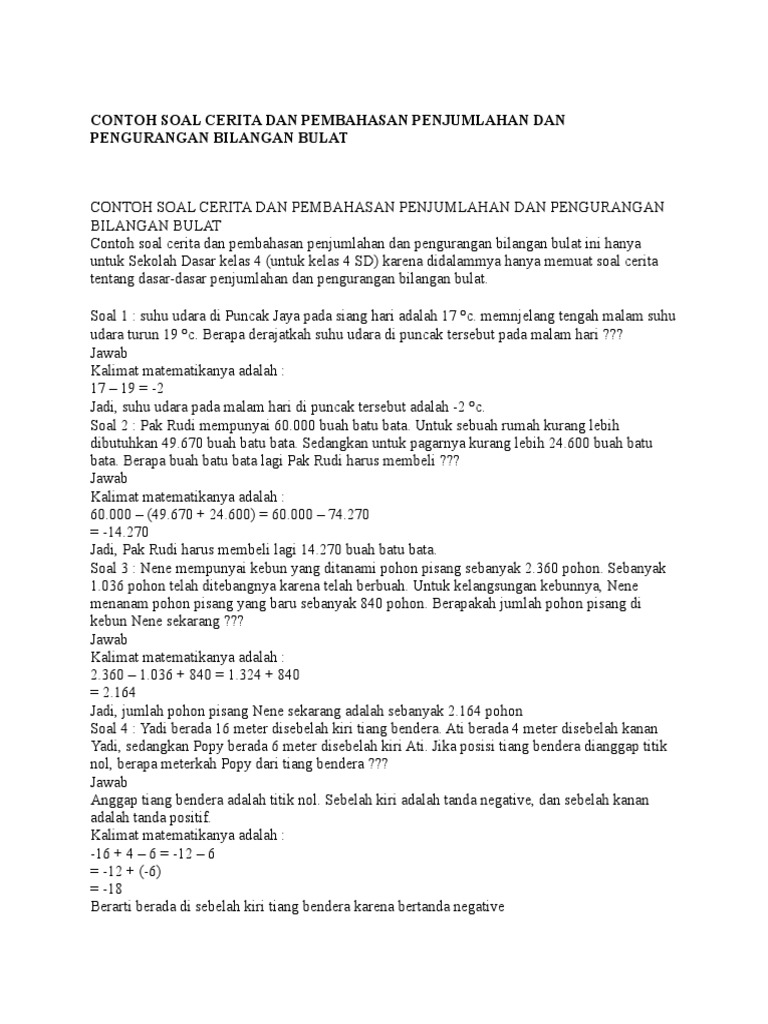 Soal Cerita Penjumlahan Dan Pengurangan Docx
