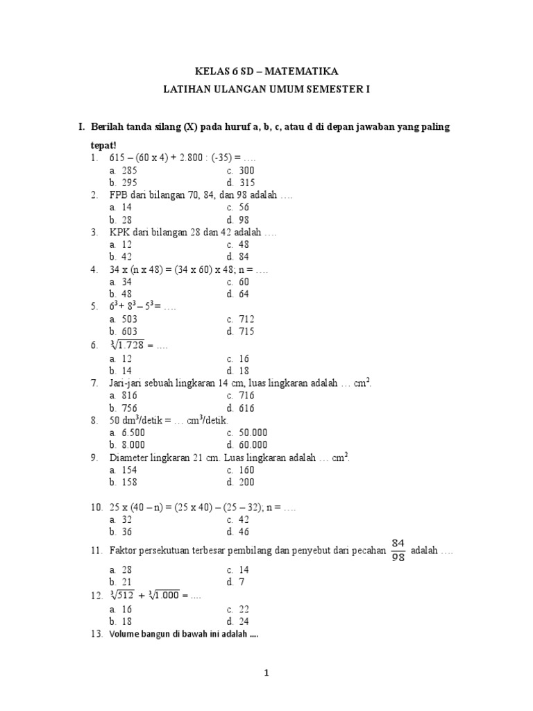 Soal Matematika Kelas 6 Sd Ulangan Umum Semester I