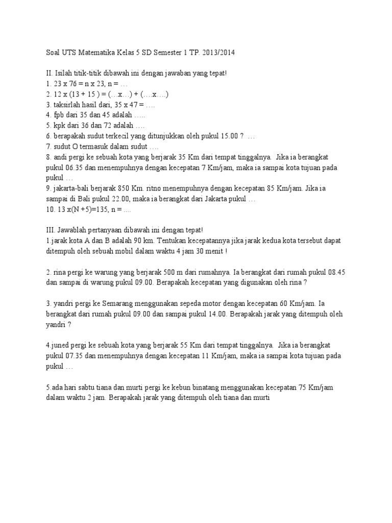 Soal Uh Mtk Kelas 5 Bab Waktu Jarak Dan Kecepatan Semester 1