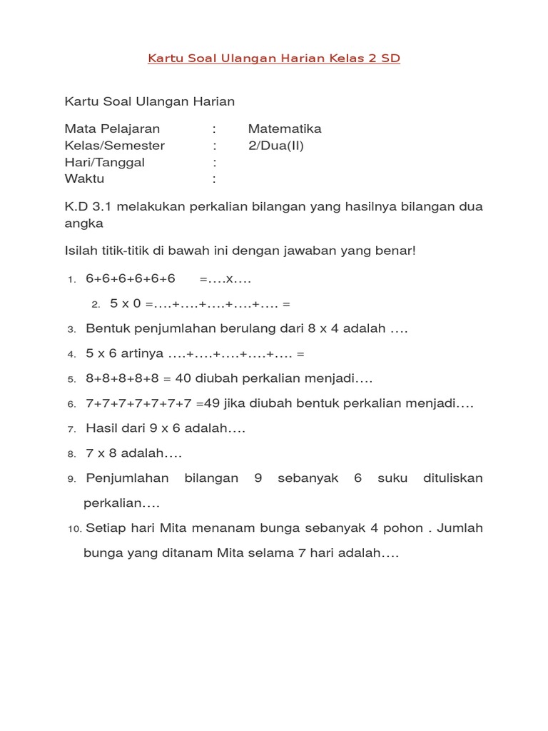 Kartu Soal Ulangan Harian Kelas 2 Sd