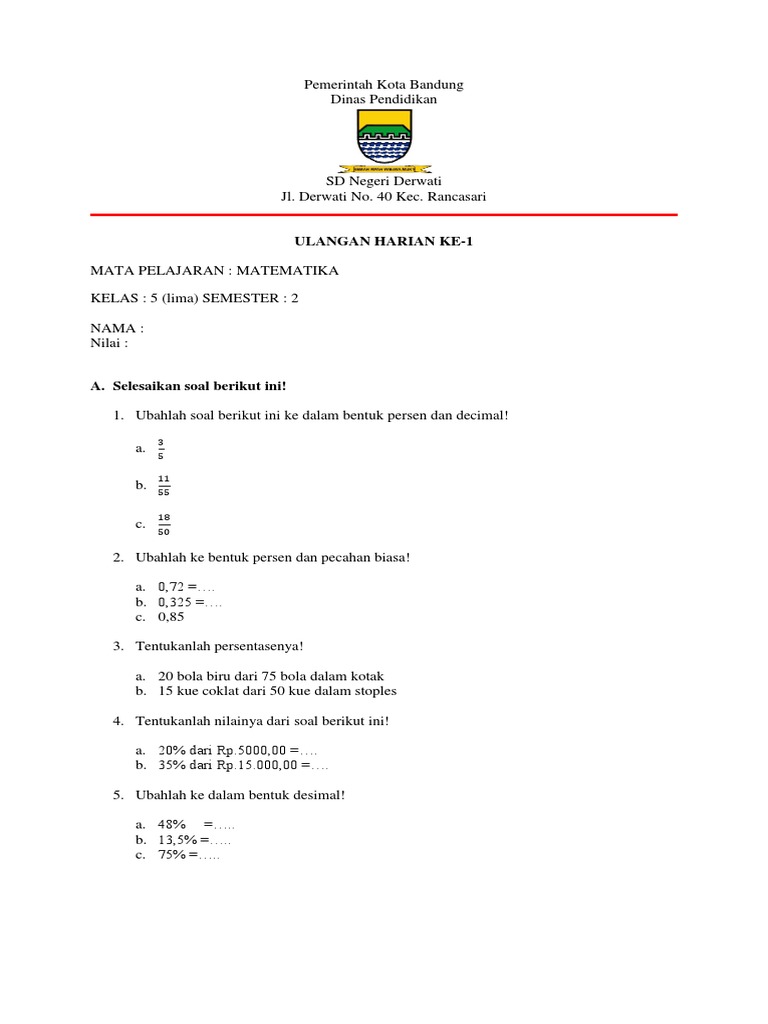 Soal Matematika Kelas 5 Semester 2 Ulangan Harian Ke 1 Docx Pdf