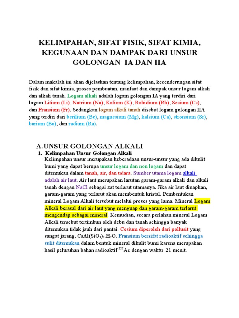 Logam Alkali Dan Alkali Tanah Unsur Sifat Sifat Contoh Soal