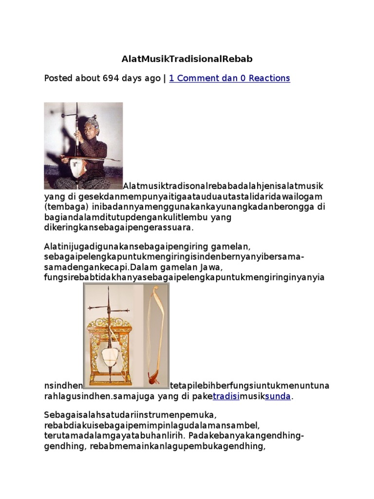 Alat musik tradisional rebab. 34 provinsi di indonesia lengkap dengan pakaian tarian rumah adat senjata tradisionalsukubahasa daerahpeta dan gambar. Seren taun merupakan kata dalam bahasa sunda yaitu seren yang artinya serah seserahan atau menyerahkan dan taun yang berarti tahun. Seperti yang pernah dibahas pada artikel sebelumnya tentang alat musik tradisional bandung degung menjadi alat tradisional bandung yang sudah terkenal di penjuru.