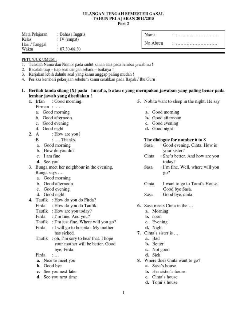 Download Latihan Soal Bahasa Inggris Kelas 6 Sd Mi Semester 1 Guru