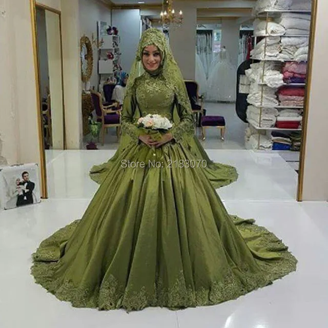 Hijau Tradisional Turki Wedding Dress Kustom Lengan Panjang Applique