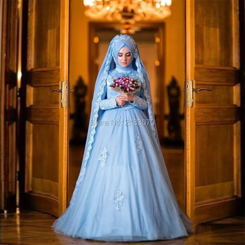 Biru Lengan Panjang Gaun Turki Jilbab Islamic Muslim Wedding Dress