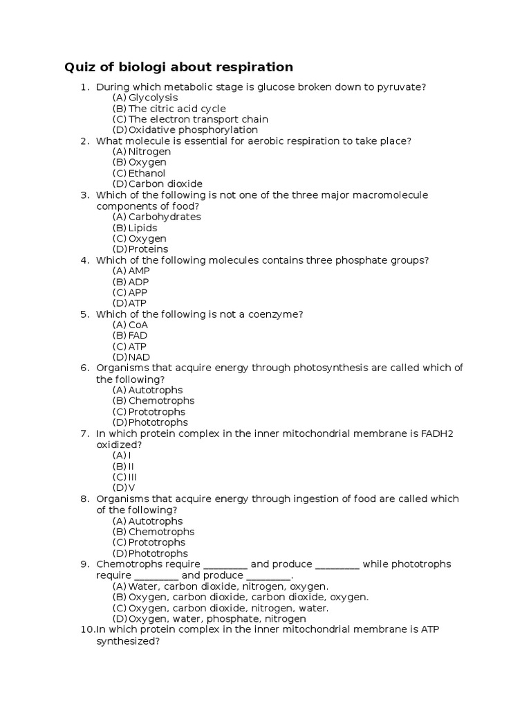 Quiz Of Biologi About Respiration Cellular Respiration Glycolysis