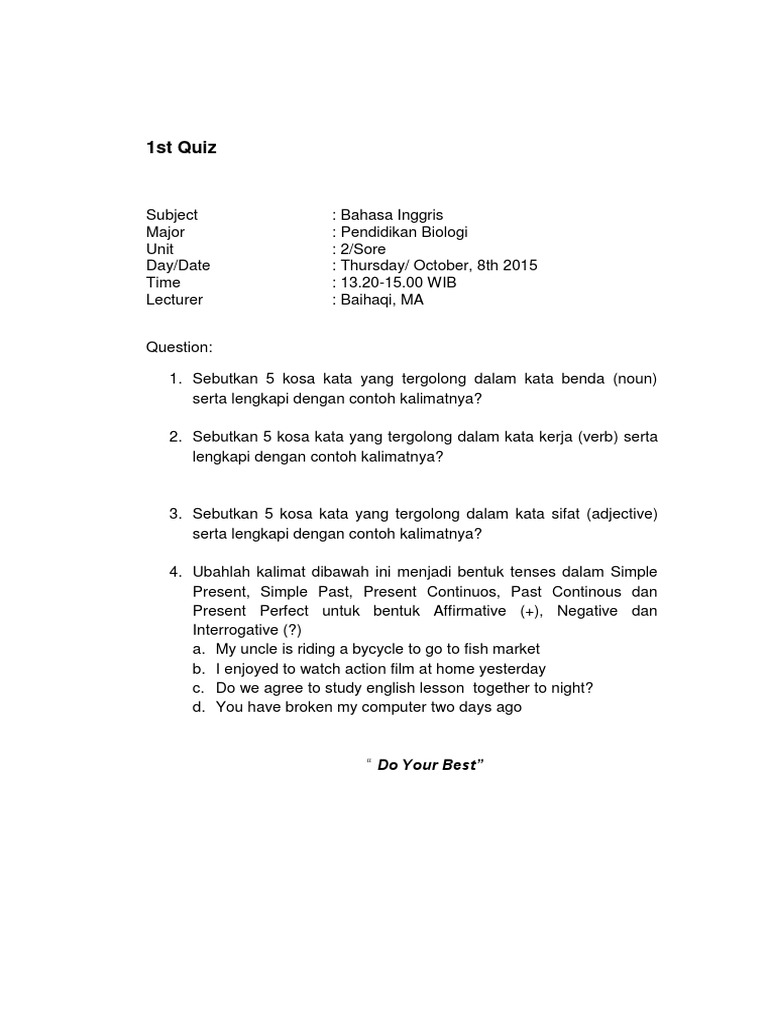 1st Quiz Bahasa Inggris Jurusan Pend Biologi Fkip 2015