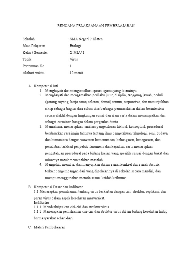 Rpp Biologi Kelas X Sma Materi Virus Kurikulum 2013 Edisi Revisi