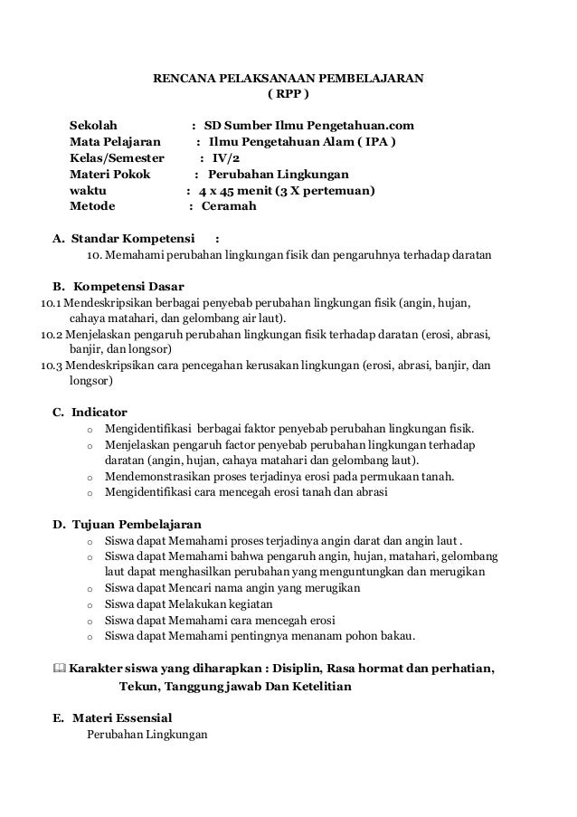 Contoh Rpp Mata Pelajaran Ipa Kelas Iv Sd