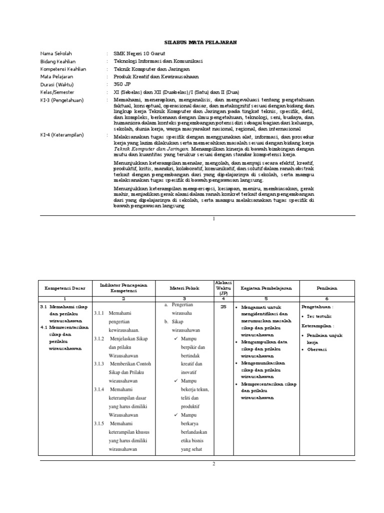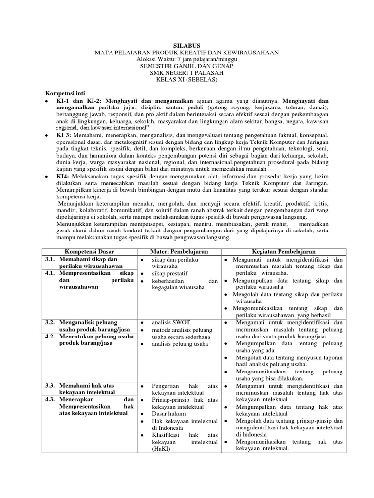 Silabus Smk Produk Kreatif Dan Kewirausahaan Kelas Xi Kurikulum 2013