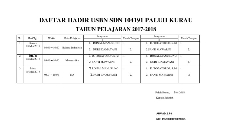 Daftar Hadir Pengawas Usbn 2016 2017