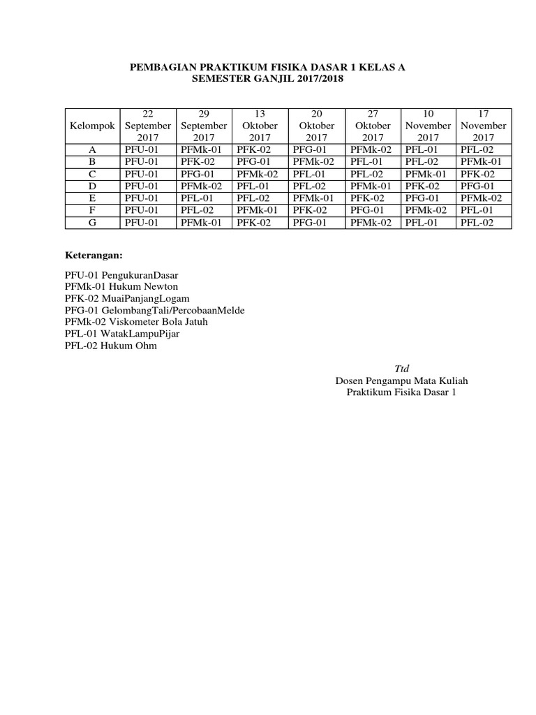 Pembagian Praktikum Fisika Dasar 1 Kelas A B C