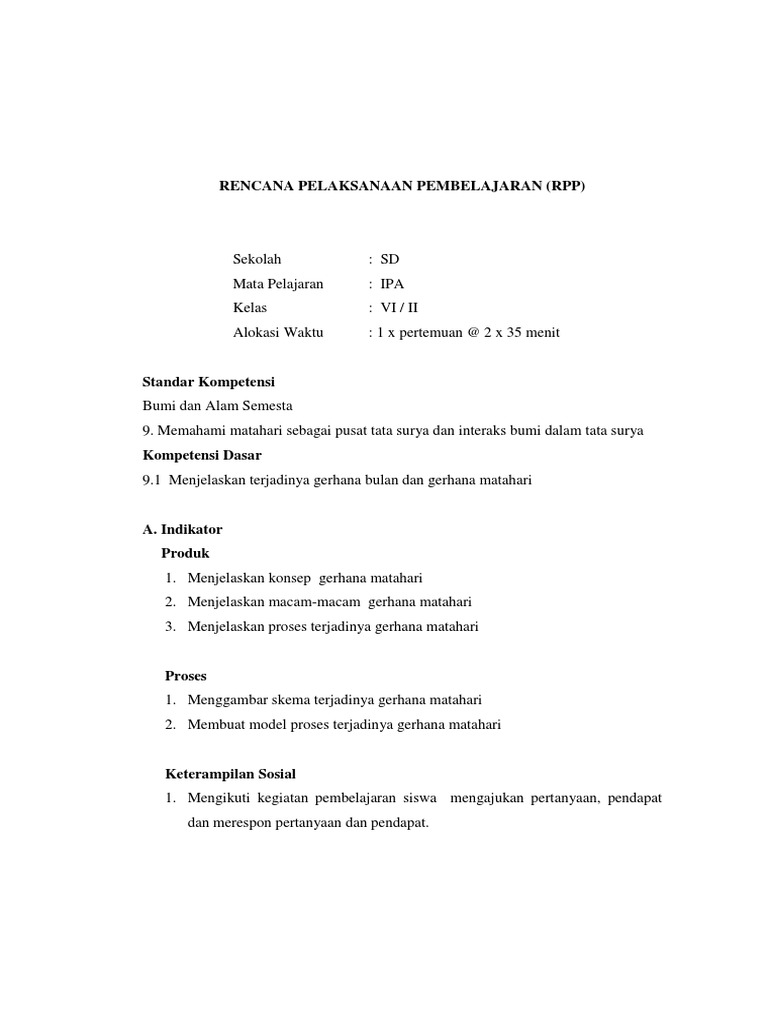 Rencana Pelaksanaan Pembelajaran Ipa Gerhana Docx Document