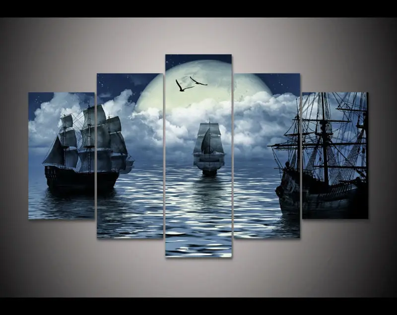 Hd Cetak 5 Pcs Kanvas Art Bulan Berlayar Kapal Laut Lukisan Modern