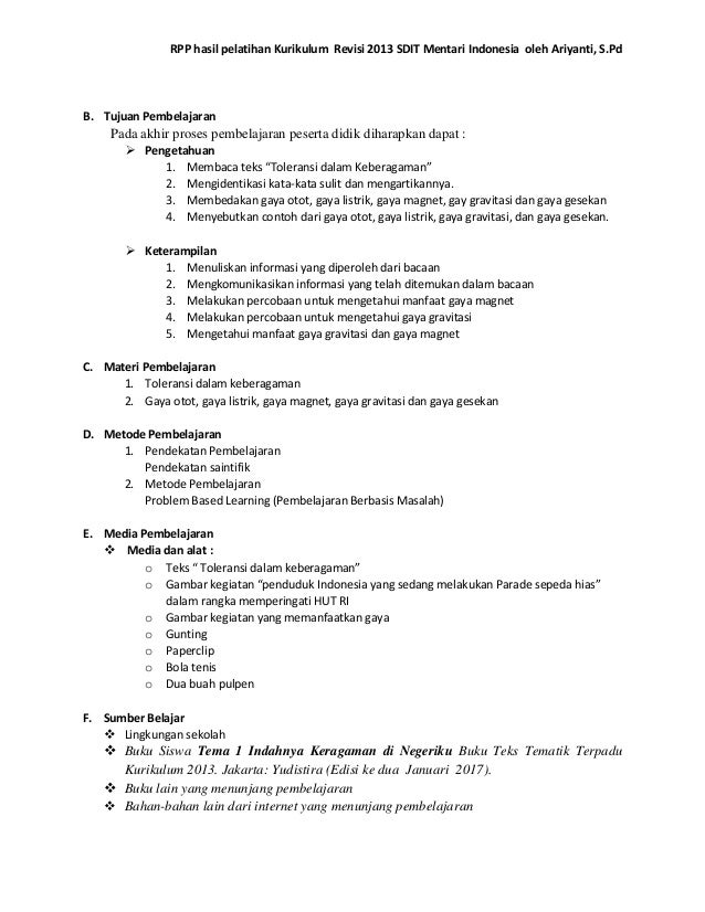 Hasil Rpp Kelas Iv Pelatihan Kurikulum Revisi 2013 Sdit Mentari Indon