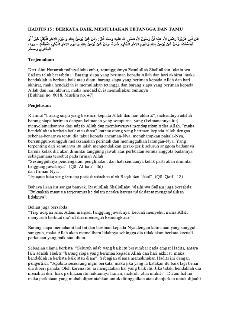 Hadis 40 15 Barangsiapa Yang Beriman Kepada Allah Dan Hari Akhir