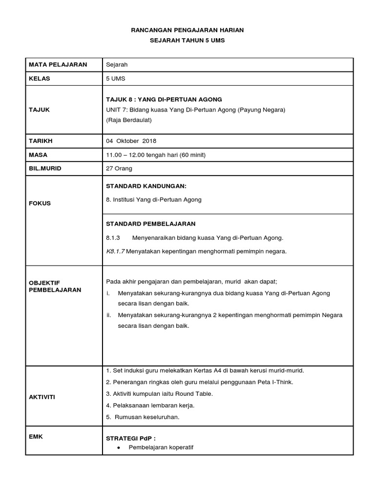 Rancangan Pengajaran Harian Sejarah Edora Mendery Academia Edu