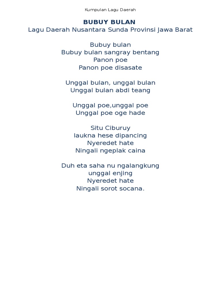 Lagu daerah jawa barat bubuy bulan. Lirik bubuy bulan oleh jawa baratsunda. Lagu daerah jawa barat bubuy bulan cipt. Bubuy bulan adalah lagu daerah yang berasal dari provinsi jawa barat dan berbahasa sunda lagu yang diciptakan oleh benny korda ini merupakan lagu yang.