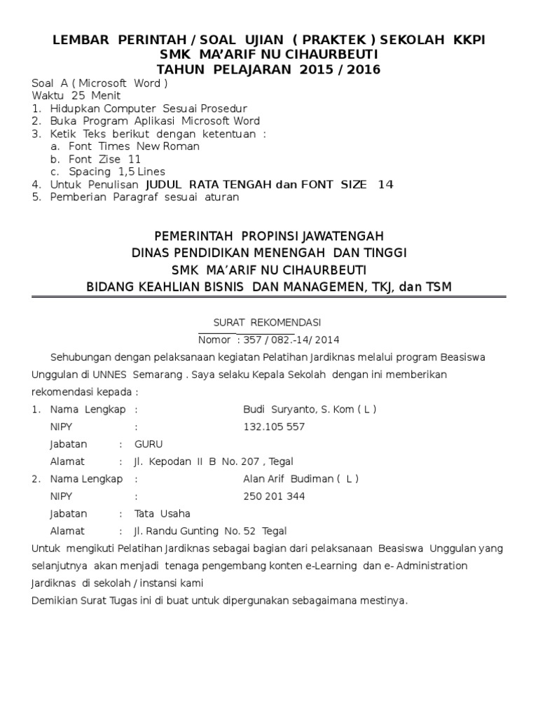 Lembar Perintah Soal Ujian Praktek Sekolah Kkpi Smk Bhakti