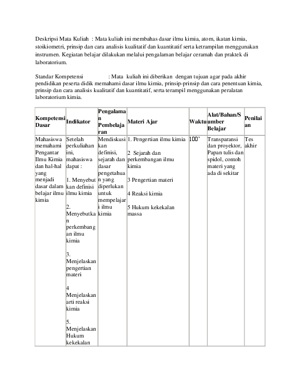 Silabus Mata Kuliah Kimia Dasar Fakultas Keguruan Dan Ilmu