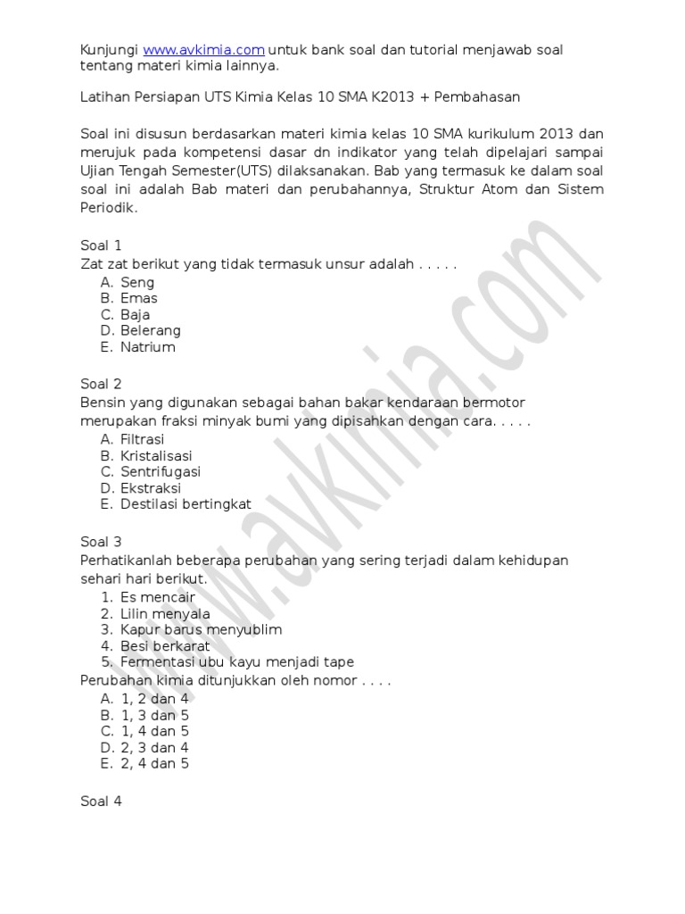Latihan Persiapan Uts Kimia Kelas 10 Sma K2013
